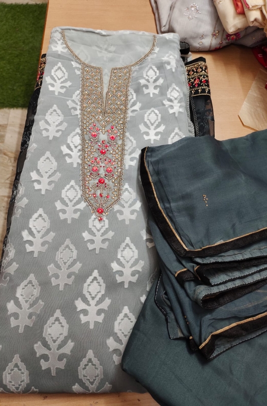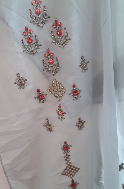 Fabric detailsTop Georgette brasso with embroidery on neck Daman and sleevesInner santoonBottom santoon Dupatta chiffon with stone work and four side lace