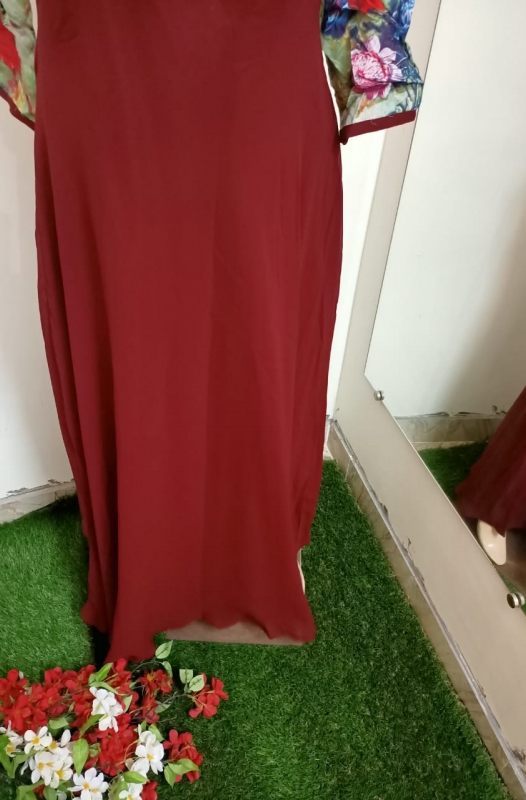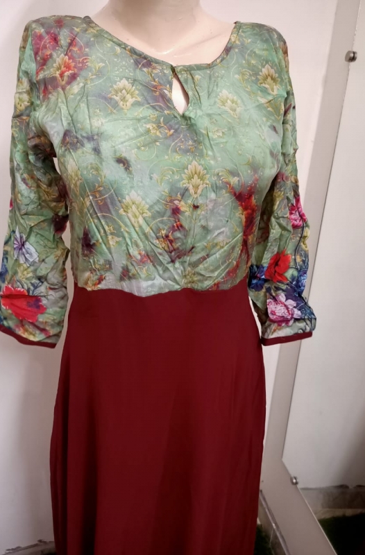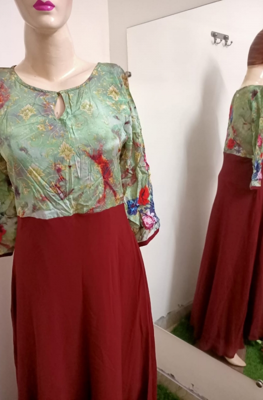 Fabric Description Body satin crepe printed with santoon inner Flair Georgette with attached inner size L 40 approx Length 55 approx wash care : easy wash