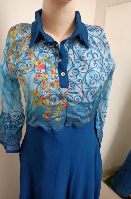 Fabric Description Body satin crepe printed with santoon inner Flair Georgette with attached inner size L 40 approx Length 55 approx wash care : easy wash